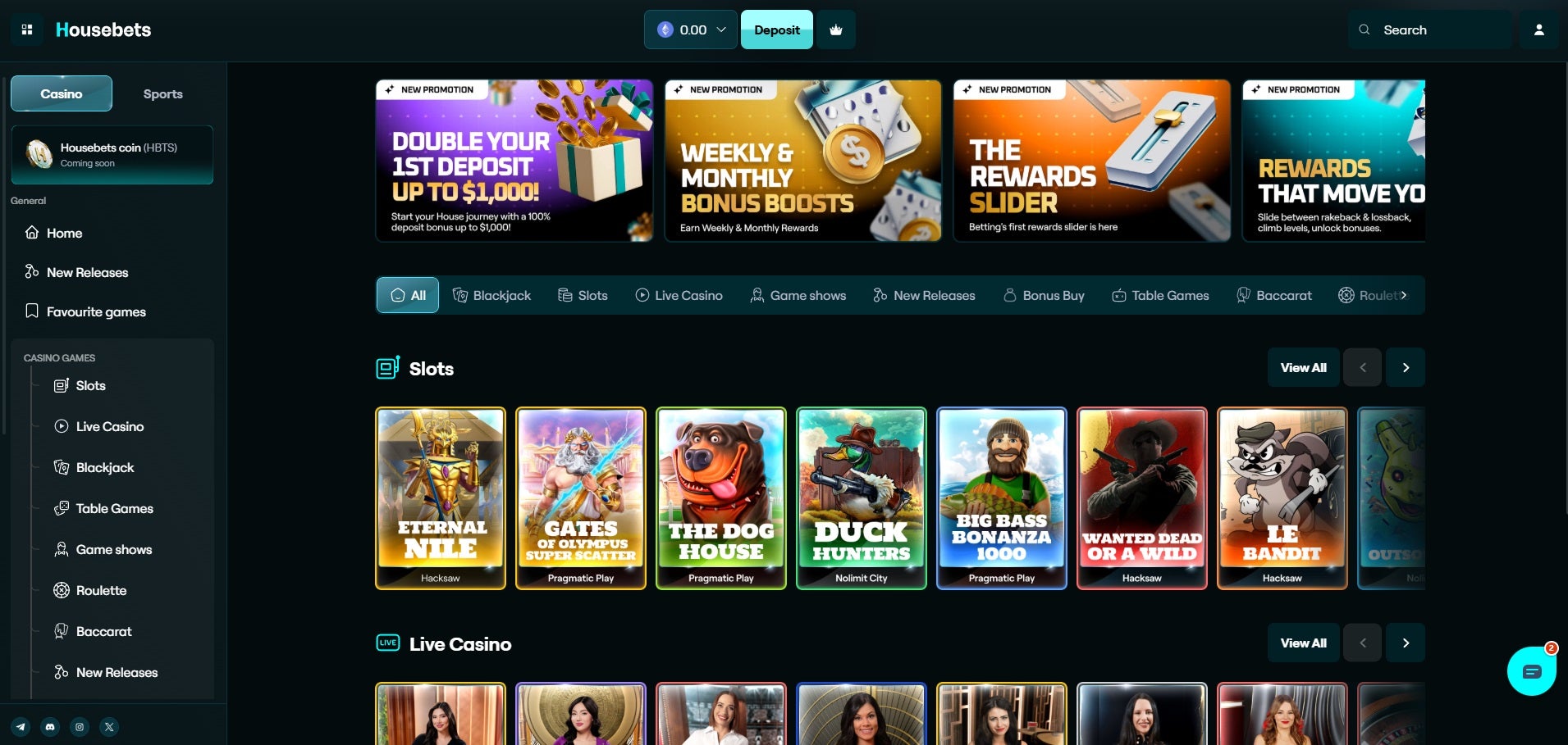 Housebets casino games are divided into multiple categories, including blackjack, slots, live casino, game shows, new releases, bonus buy, table games, baccarat, roulette, mini games, and hot games. You can see the latest bets at the bottom of the page, check your bets, or find high-stakes bets on the platform.